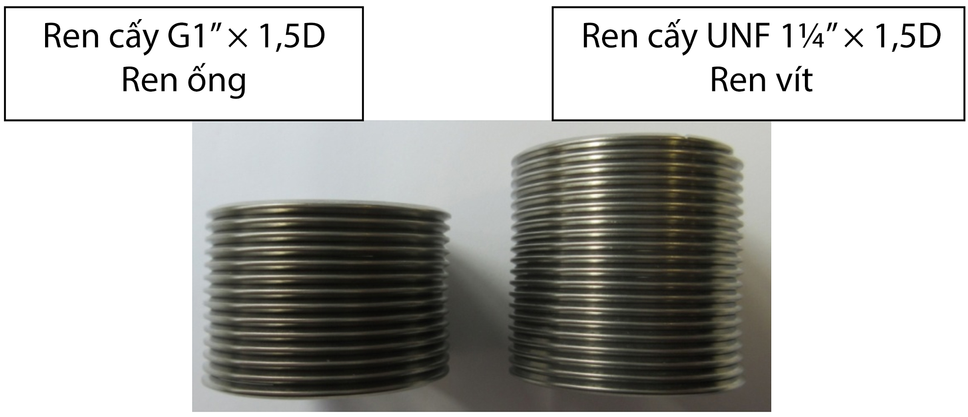 - Nếu so hai vòng ren G1” × 1,5D (ren ống) và UNF 1¼” × 1,5D (ren vít), vòng G1” sẽ có vẻ ngắn hơn, nhưng cả hai đều đúng chuẩn 1,5D theo đường kính danh nghĩa.