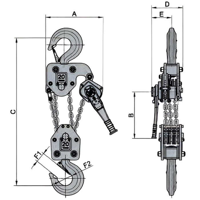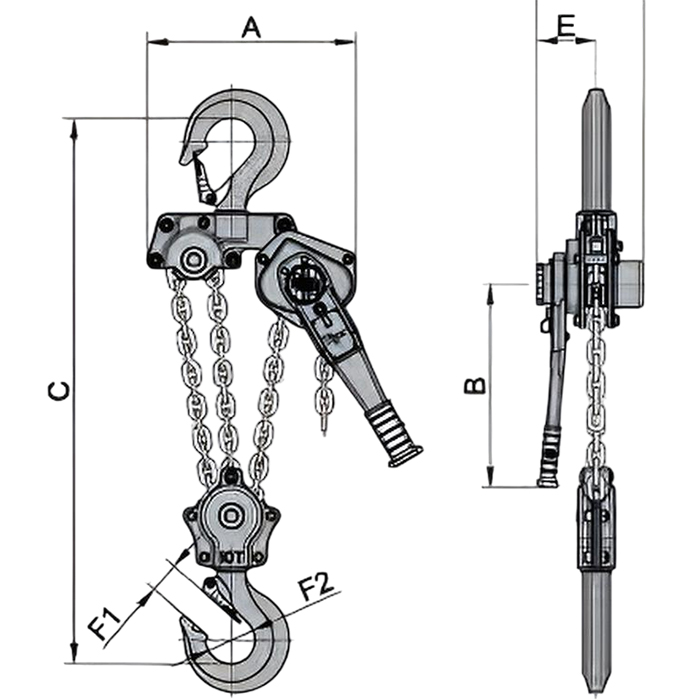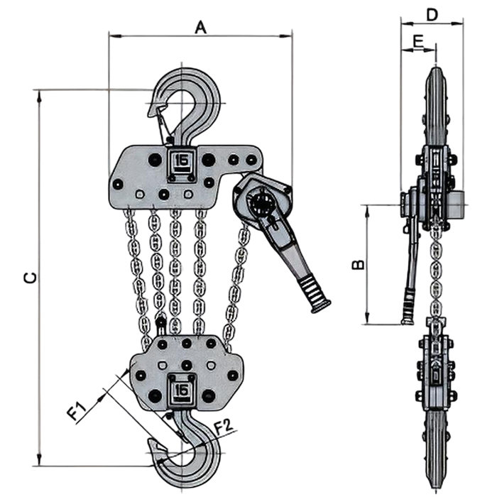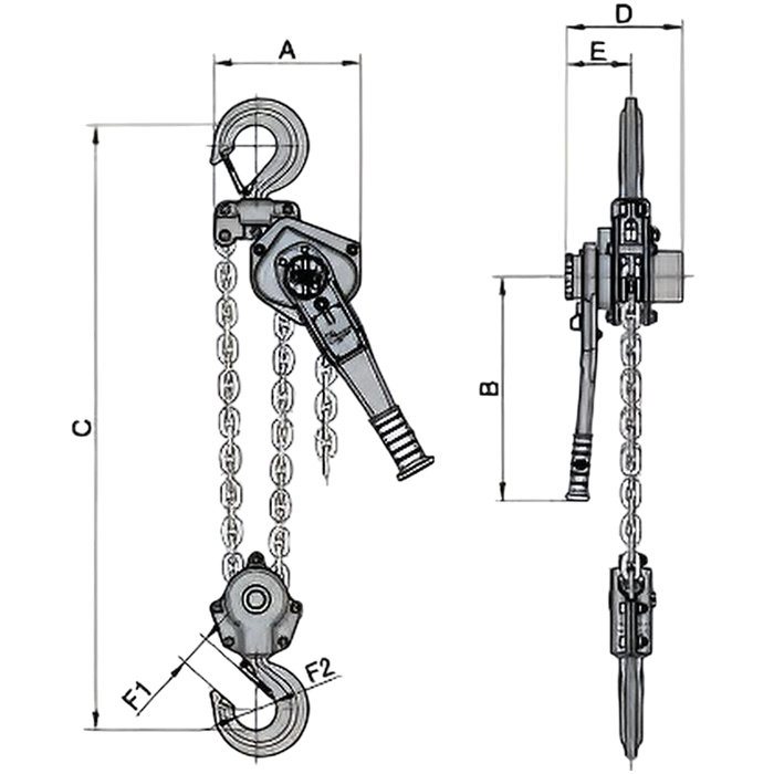 | Model | Tải trọng | Lực | Xích tải | Chiều cao nâng tiêu chuẩn | Khối lượng tiêu chuẩn | |