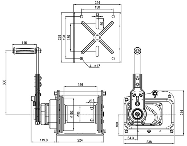 Vị trí các lỗ kỹ thuật trên mắt đế của tời tay 2 tấn Industrial Winch. Các lỗ điều chỉnh dung sai, bắt vít cố định xuống vị trí công tác. Bản vẽ kích thước chi tiết vui lòng cuộn lên phía trên. Rất hữu dụng cho người làm công tác thiết kế hệ thống, tích hợp trên tổng thể.